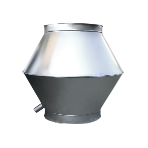 Caratteristiche tecniche: terminale in acciaio zincato a doppio cono contrapposto con rete e con vasca di raccolta e scarico acqua piovana