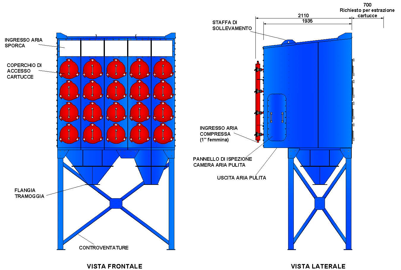 Inoltre, nella versione ATEX è previsto il collegamento di messa a terra in tutte le parti del filtro a cartucce.